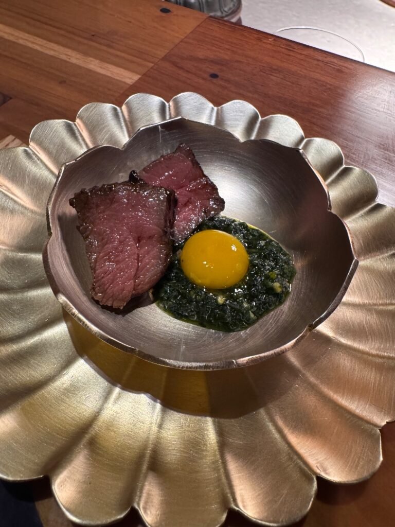 The next course was called Kebab. It featured pork and quail egg yolk, served with sawtooth coriander chutney. The quail egg yolk was completely new to us and added a rich texture that balanced the freshness of the sawtooth coriander chutney.
